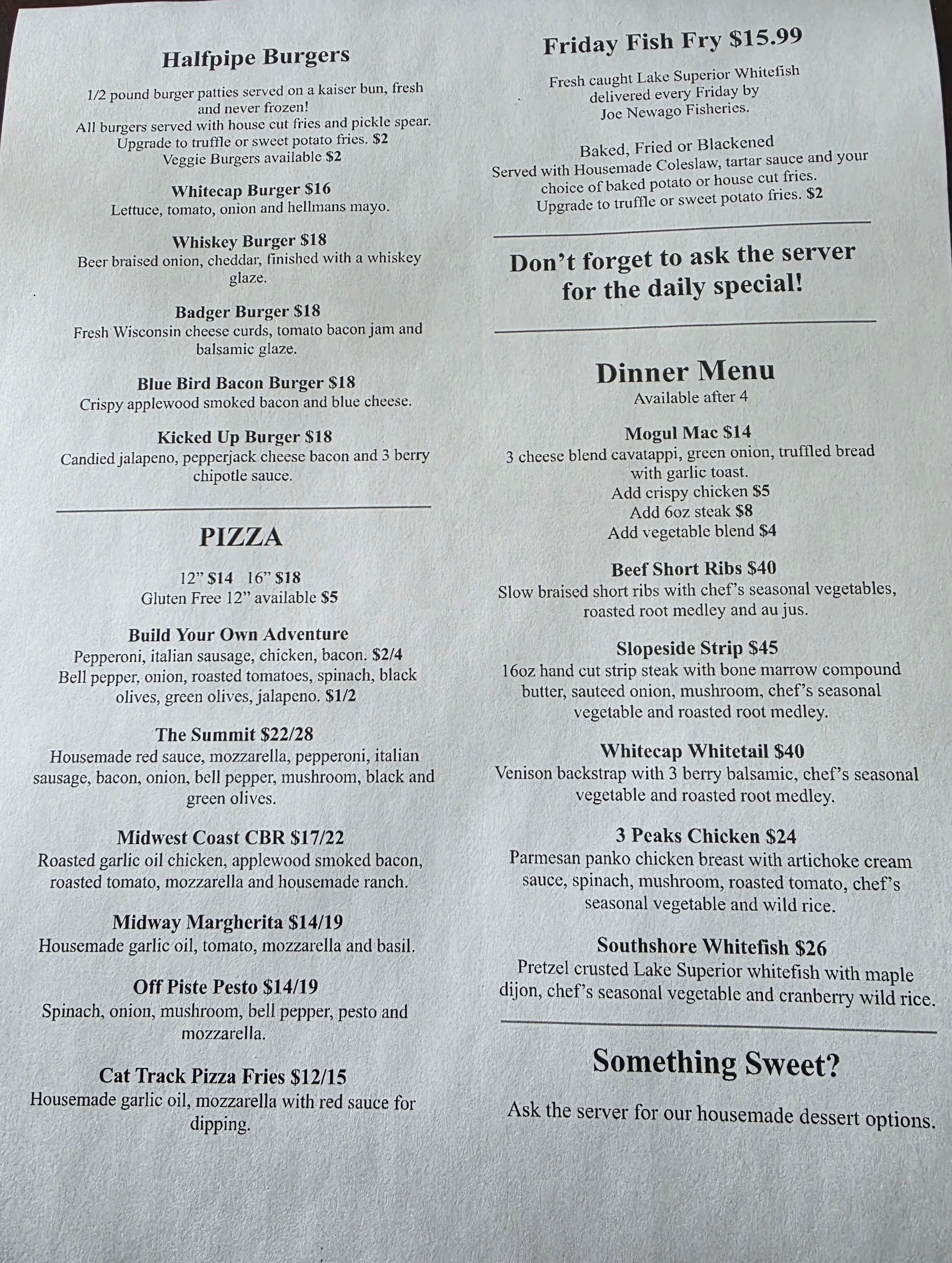The Whitecap Mountains Bar and Restaurant is located in the hotel lodge and is an awesome spot to grab lunch or dinner within steps to your room! With many options to choose from our restaurant team will serve you up something delicious! We have friendly bartenders and servers that will take care of you.